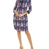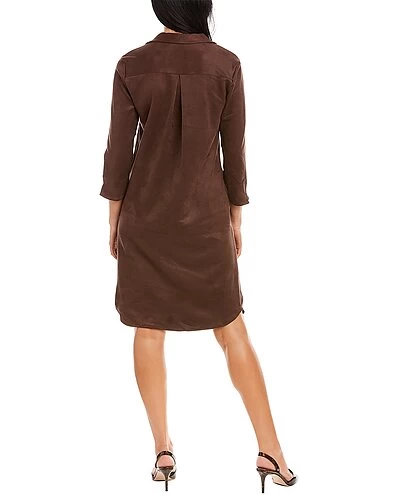 - Caelin Dress in mocha with spread collar, V-neck, 3/4-length sleeves, dual side on-seam pockets, and curved hem