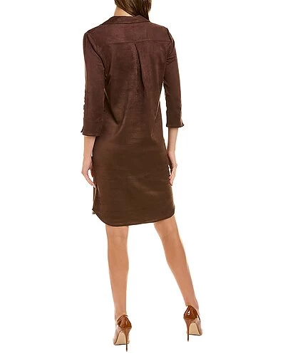 - Caelin Shift Dress in mocha with faux suede, side seam pockets, and inverted back pleat