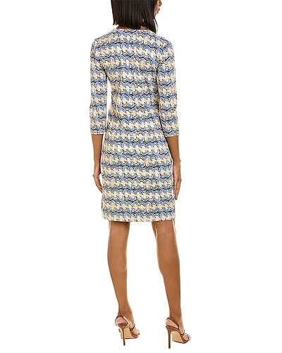 - Carly Catalina Cloth Sheath Dress in navy & blue & tan bantu with split neck and 3/4-length sleeves