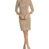 - Catalina Cloth Sheath Dress in off white and brown leopard with 3/4-length sleeves and princess seams