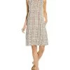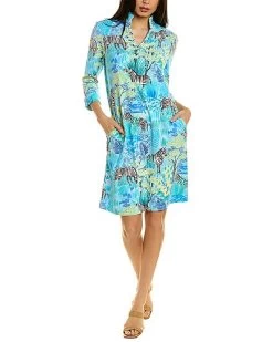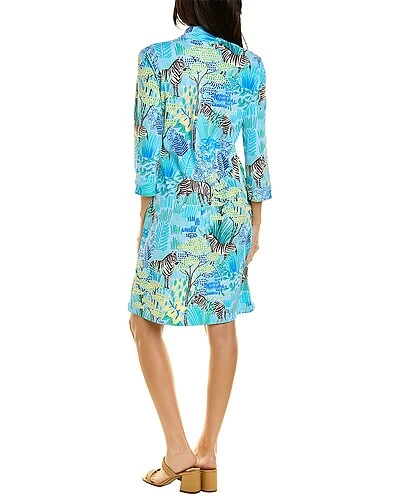 - Gardenia Catalina Cloth Shift Dress in blue multicolor with 3/4-length sleeves, mandarin collar, and side seam pockets