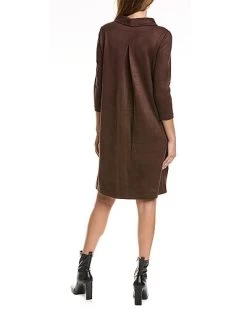 - Lenka Shift Dress in mocha with faux suede design, 3/4-length sleeves, side seam pockets, inverted back pleat, and cowl neck