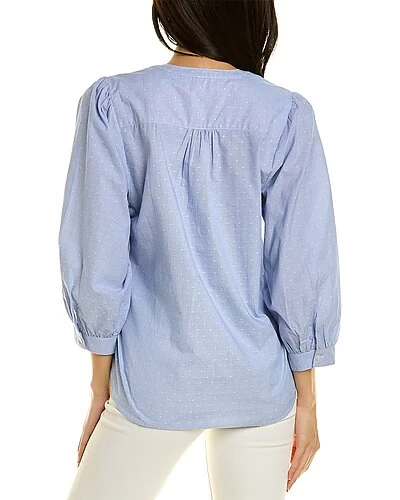 - Megyn Swiss Dot Blouse in blue and white with 3/4-length sleeves and shirttail hem