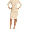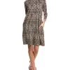 - Sheila Sweaterdress in black, brown, and white with jacquard design, mock neck, and inverted back pleat