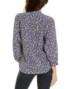 - Sherry Silk-Blend Blouse in navy & aqua with mandarin collar, 3/4-length sleeves, button cuffs, and shirttail hem