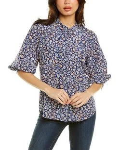 - Sherry Silk-Blend Blouse in navy & aqua with mandarin collar, 3/4-length sleeves, button cuffs, and shirttail hem